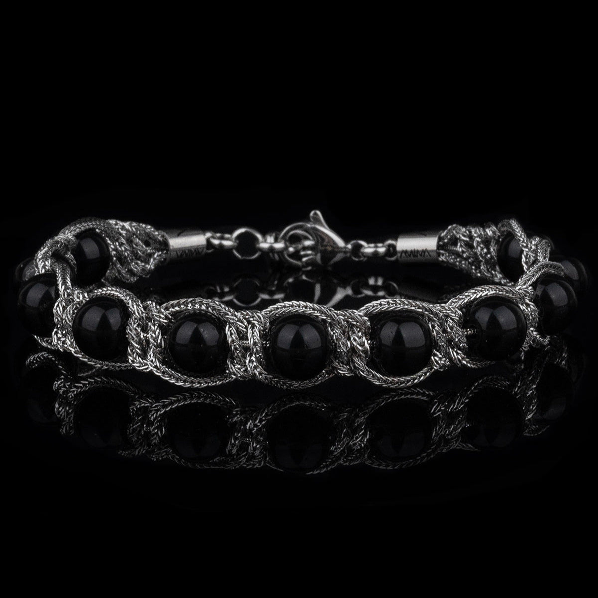 Bracciale artigianale AMIMA - Bracciale "SHAMBALLA NERO" in acciaio inossidabile e pietre onice nero.