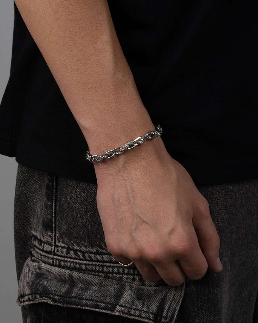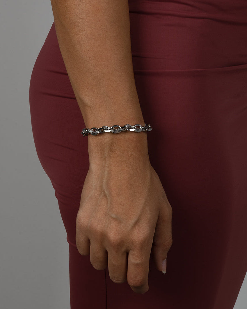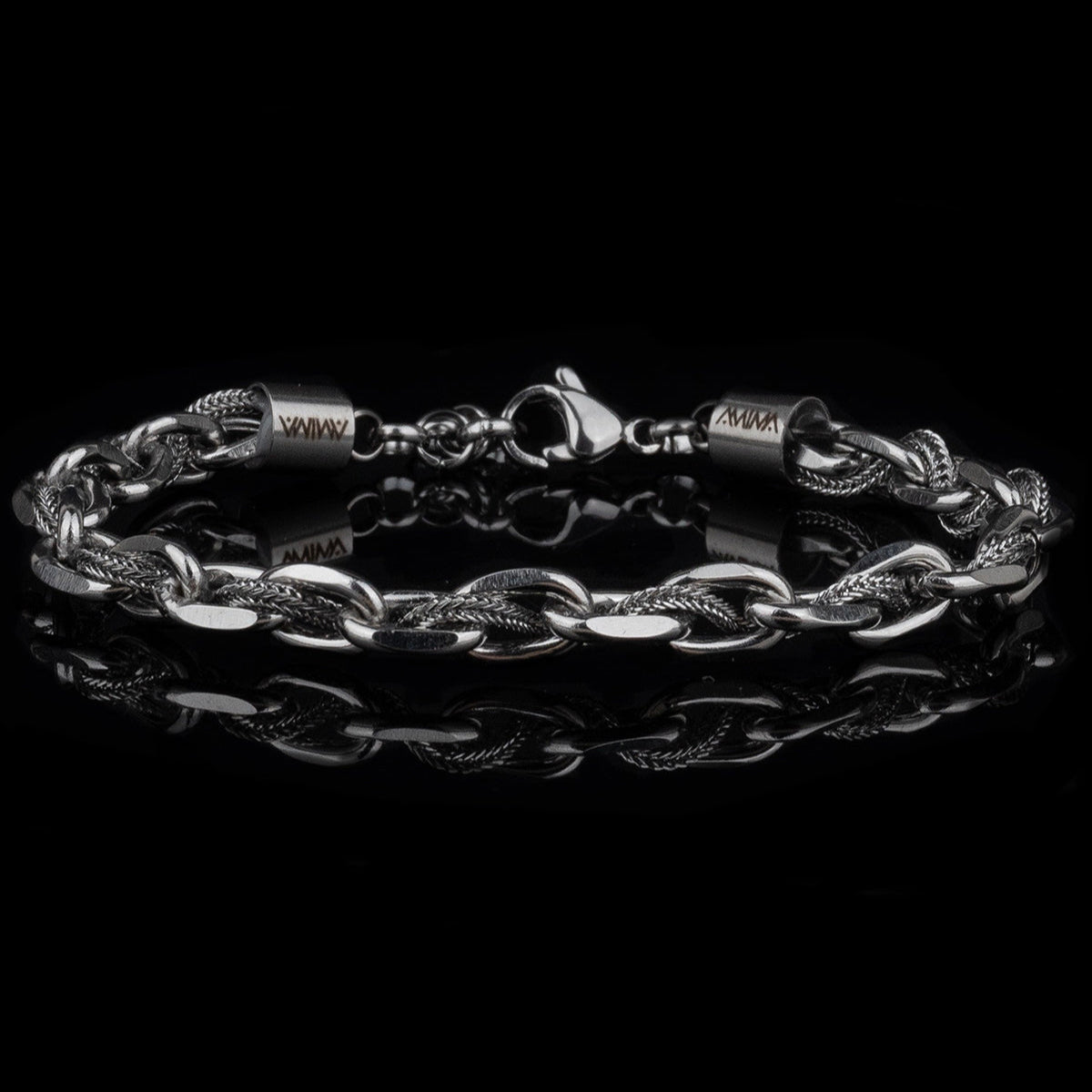 Composto da 1 "groumette chain" in acciaio inossidabile che funge da base incastonata ed avvolta con catena in acciaio inossidabile in una chiusura regolabile con moschettone.